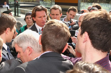 MELBOURNE, AUSTRALIA – SEPTEMBER 19: James Hird the Essendon coach speaks to the media outside the Melbourne Federal Court on September 19, 2014 in Melbourne, Australia. (Photo by Quinn Rooney/Getty Images)