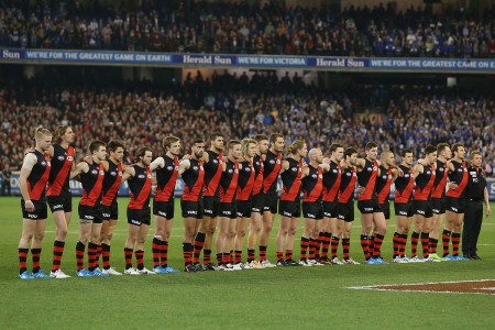 MELBOURNE, AUSTRALIA – SEPTEMBER 06: Bombers players line up for the anthem during the Second Elimination AFL Final match between the North Melbourne Kangaroos and the Essendon Bombers at Melbourne Cricket Ground on September 6, 2014 in Melbourne, Australia. (Photo by Michael Dodge/Getty Images)