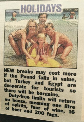 Where was the good news from this pro-Brexit paper? Oh wait for it, it was under ‘Holidays’. Duty-free limits will return on booze. Okay, that’s bad news. But there was a silver lining. It was this: