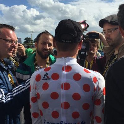 Paul Voss for Bora-Argon 18 is interviewed after securing the polka dot jersey after Day 1, 2016 Tour de France; copyright N Hickey & C Fox